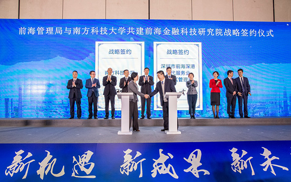 12月7日,“新機(jī)遇•新成果•新未來(lái)——2019前海成果發(fā)布會(huì)”在前海深港合作區(qū)舉行。發(fā)布會(huì)上,前海管理局局長(zhǎng)助理、前海地方金融監(jiān)管局常務(wù)副局長(zhǎng)文娉與南方科技大學(xué)校長(zhǎng)辦公會(huì)成員王鵬飛代表雙方簽署了“前海管理局與南方科技大學(xué)共建前海金融科技研究院”的戰(zhàn)略合作協(xié)議。深圳市委常委、前海蛇口自貿(mào)片區(qū)管委會(huì)主任、前海管理局局長(zhǎng)田夫等領(lǐng)導(dǎo)見(jiàn)證簽約。
