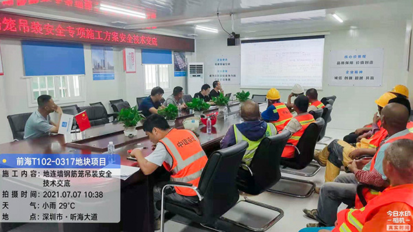由于本項(xiàng)目施工場地小、地質(zhì)條件復(fù)雜,地連墻吊裝難度大,安全風(fēng)險(xiǎn)高。為保障工程的順利實(shí)施,建設(shè)單位在施工前組織各參建單位技術(shù)人員和業(yè)內(nèi)知名專家進(jìn)行了方案比選及評審,有效解決了各類施工技術(shù)難題。在鋼筋籠起吊就位前,建設(shè)單位、代建單位、監(jiān)理單位和施工單位一同進(jìn)行了超危大工程安全專項(xiàng)驗(yàn)收。在機(jī)械設(shè)備檢測及驗(yàn)收合格,鋼筋籠初驗(yàn)、整改、復(fù)檢合格的情況下,施工單位按規(guī)定組織對作業(yè)班組質(zhì)量和安全技術(shù)交底,所有特種作業(yè)人員持證上崗,吊裝范圍內(nèi)設(shè)置安全警戒區(qū),并配置專人值守,為地連墻成功吊裝保駕護(hù)航。