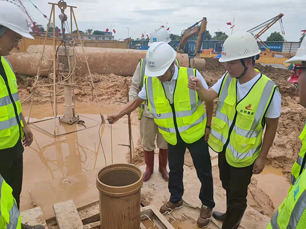 項目主體工程樁共有243根,其中抗壓樁44根,直徑為2.2米、2.4米,樁端入微風化混合花崗巖500mm;抗壓兼抗拔樁199根,直徑為1.2米,樁端持入中風化混合花崗巖4米。工程樁全部采用旋挖鉆孔混凝土灌注,計劃高峰期投入六臺旋挖鉆機。首樁澆筑預(yù)示著項目永久結(jié)構(gòu)正式開始施工,相關(guān)數(shù)據(jù)的試驗獲取對后續(xù)施工開展具有指導(dǎo)意義。