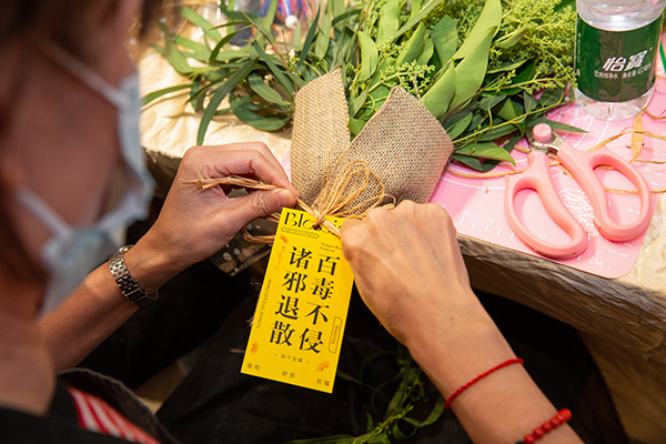 活動現場,手工老師一邊示范著香包和艾草花束的制作技藝,一邊介紹了兩項習俗的來歷。在老師的指導下,大家學會了不同的縫制手法,比如簡單的平針、鎖針,或者略難的藏針等針法;也認識了寓意吉祥平安、庇護家人的各種花材,比如艾草、菖蒲、香樟果、玉簪葉、黃金球等。