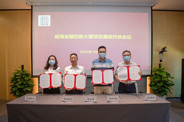會上,參建單位代表圍繞如何加強建設項目黨風廉政建設工作進行了深入交流。前海金控公司與中建科工、金地集團、合創公司聯合簽署了《廉潔共建合作備忘錄》,作為各方共同遵守的廉潔合作行為準則。